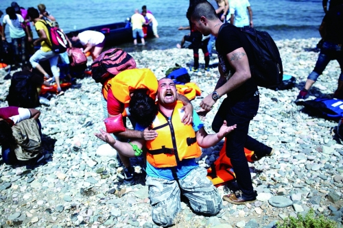 9月7日,一名叙利亚人登上希腊莱斯博斯岛后跪地祈祷。这些难民乘充气筏从土耳其出发,穿越了爱琴海。 |