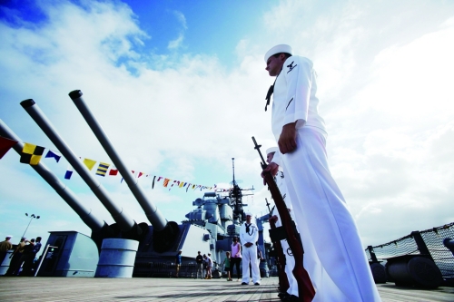 9月2日,美国夏威夷,位于珍珠港的“密苏里”号战列舰博物馆在举行二战胜利70周年纪念活动,部分美国二战老兵出席。