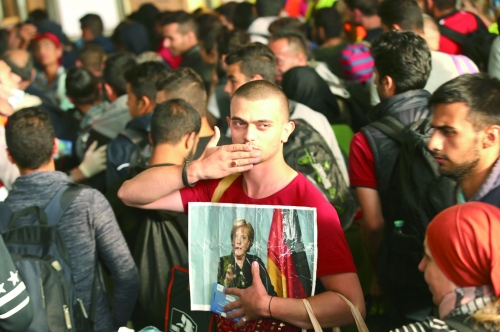 9月5日,到达德国慕尼黑的叙利亚难民手捧德国总理默克尔的照片。 |