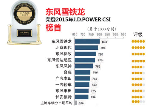 据J·D·POWER亚太公司2015年中国售后服务满意度研究(CSI)报告显示,在主流车细分市场中,东风雪铁龙以804分拔得头筹。