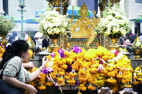 9月4日,泰国曼谷,受损的四面佛神像已完成修复,民众前来祈祷。