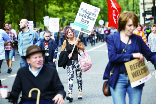 9月12日,民众在伦敦组织游行,要求英国政府收留更多叙利亚难民。 |
