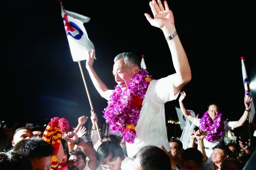 9月12日,新加坡大选结果于凌晨揭晓,执政党人民行动党获胜,总理李显龙与支持者庆祝胜利。