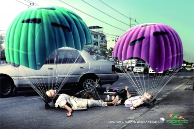 泰国健康促进基金会所作的公益广告海报,呼吁人们骑车外出时戴上头盔。 |