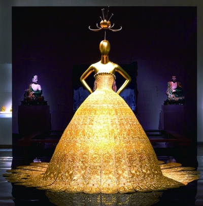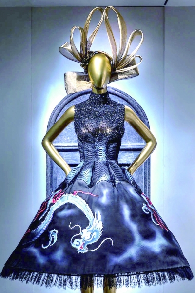 国际知名设计师和时尚前沿人物,如亚历山大·麦昆、伊夫·圣·罗兰、安娜·温图尔对中国的想象,都陈列在3层的展区中。圣罗兰晚装外套的肩饰灵感来自公元5世纪的中国青铜器,而迪奥晚礼服上的装饰则是中国书法。