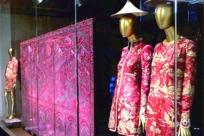 在各个展厅里,艺术作品和灵感的起源并排陈列,构成了文化的对话。如在旗袍展厅中,一件中国旗袍旁边,是西方设计师根据这件旗袍设计的新作品。