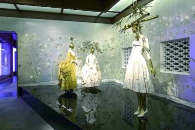 为了营造气氛,策展人用有机玻璃制作了竹林,中式庭院则变成撒满月光的水池,出自约翰·加利亚诺之手的礼服仿佛浮在水面上。服饰周围是古色古香的鼻烟壶、书法、瓷器和中国织锦,大屏幕上播放着王家卫、张艺谋、陈凯歌和李安的电影作品。