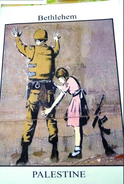在巴以墙的一个拐角处,有一只展翅欲飞的和平鸽,鸽子的胸口处中弹,伤口贴着创可贴,但仍然鲜血直流,滴落在这片沉重的大地上。我想,流淌的不只是和平鸽的血,更是渴望和平的人内心的血。