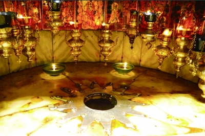 进入圣诞教堂,从一个小楼梯下去,便能看到耶稣诞生的那个马槽,被称为伯利恒星洞。仔细观察,这个槽位于长13米、宽3米的地下岩洞中,相传一开始是泥马槽,后被人用银马槽替代。再往后,银马槽被换成了大理石圣坛,上面镶嵌着一枚空心的14角伯利恒银星,以表示耶稣出生的具体位置,并镌刻着拉丁文铭文:圣母玛利亚在此生下基督耶稣。圣坛上空悬挂着15盏属于基督教各派、在不同时间点燃的银制油灯,昼夜不灭地映照着这块狭小却神圣的角落。