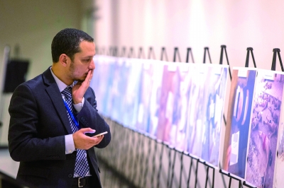 2015年3月,纽约联合国总部大楼内举办关于叙利亚战争的摄影展。一名代号“凯撒”的叙利亚军警拍下了这些照片,联合国希望这些展现饥饿、窒息致死以及挖眼酷刑的图像引起人们对战争的深思。图片来源 CFP |