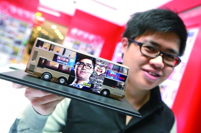 周文豪手持贴有其招生广告的巴士模型。