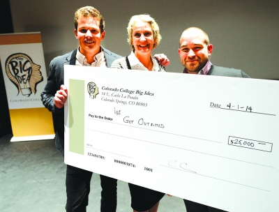 科罗拉多学院院长吉尔·蒂芬塔勒(中)向学校“伟大构想”商业创意大赛的优胜者颁发奖金。 |