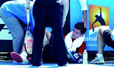 2014年1月,名将德约科维奇在澳网赛场上不支倒地。