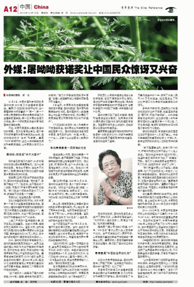 外媒:屠呦呦获诺奖让中国民众惊讶又兴奋
