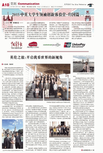 “2015中英大学生领袖创新体验营”项目由中华全国青年联合会指导,中国青年报社携手中国高校国际交流社团联谊会,与英国共同目标基金会共同主办,银联国际作为战略伙伴及独家赞助,给予全程支持。