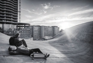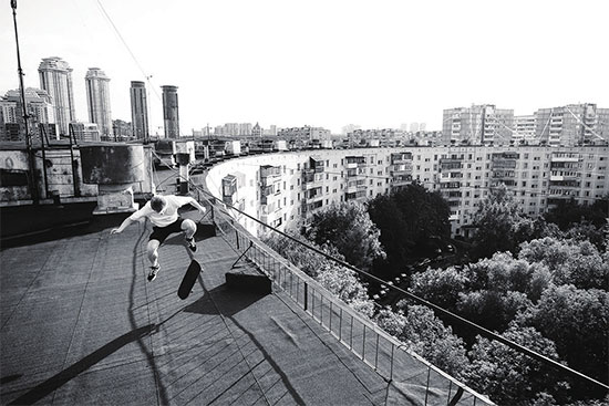 终于,年轻人们“攻占”了建筑物的制高点,任由冷风呼啸着将他们的连帽衫卷起。突然,有人跳上滑板,在电光石火之间沿着凹面溜了下去。此刻,莫斯科黎明时分的全景在这些都市冒险家面前凝固,远方,高尔基公园里的摩天轮看上去从来没有如此清晰。