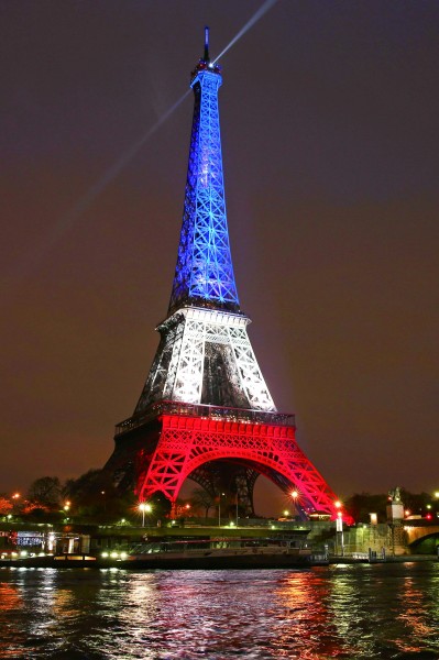 当地时间11月16日,法国巴黎,埃菲尔铁塔亮起法国国旗色灯光,悼念巴黎系列恐怖袭击事件遇难者。