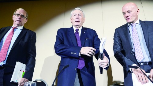 WADA调查报告发布会现场,调查委员会主席庞德(中)会后离席。 |