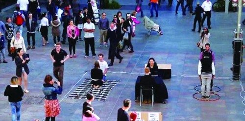 路人好奇围观“国际解放者”组织的目光接触实验。 |
