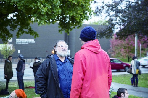 活动开始仅仅20分钟后,克里斯蒂公园下起了倾盆暴雨,秋叶在寒风中瑟瑟落下。人们躲在树下,仍然免不了被冰冷的雨滴打湿,但也有人举着伞盘腿坐在地上,不愿打破彼此的凝视。
