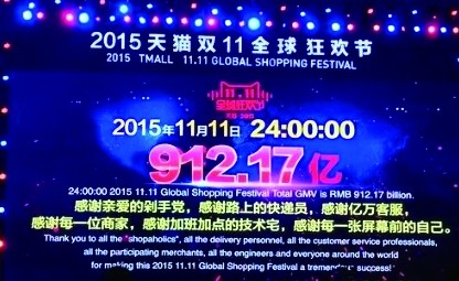 当天,来自阿里巴巴的数据显示,零点刚过1分12秒,天猫“双11”的交易额已超10亿元;5分45秒,交易额超50亿元;17时28分,交易额超719亿,超过2014年全国社会消费品单日零售额;截至11日24时,仅阿里巴巴天猫平台的交易额就达912.17亿元,其中无线成交占比68%。