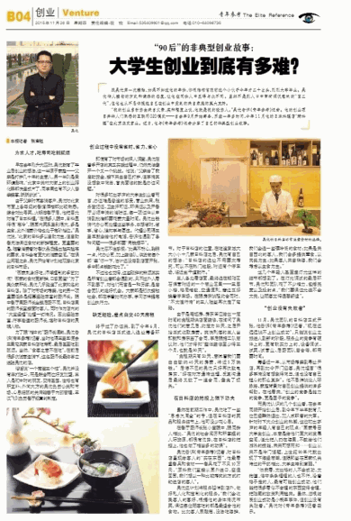 11月,吴优团队的日料店正式开张,他告诉《青年参考》记者,“现在还远远谈不上创业成功”,只能说创业之旅进入到新的阶段,服务业的竞争有硬件上的,更有软实力上的,设备调试、试菜、试营业、后厨团队磨合等,都需要时间。