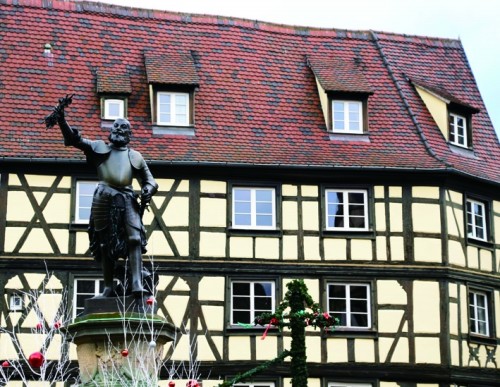 小镇上的几个著名建筑也透着神秘的童话色彩。圣马丁教堂的墙面用鹅黄色的石块堆砌而成,屋顶上铺着绿色、黄色、橙红色的鳞片形状的砖瓦,色彩和花纹都十分罕见,与远处海关大楼的屋顶遥相呼应;建于1537年的普菲斯泰屋则古朴神秘,形状独特的尖顶和凸肚窗都十分抢眼;建于1609年的人头屋,正面有105颗人面头像,表情各异,生动有趣。