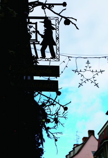 缤纷的木筋屋是小镇最好的背景,给镇上的一切事物增添了温馨浪漫的气息。但科尔马之精巧不仅仅在于木筋屋,整个小镇仿佛是精心布置过的童话世界,充满了各种有爱的细节:冬日的运河少了夏日的游船,静静地穿城而过,蜿蜒曲折,给小镇赋予不少灵气;街道两旁的许多餐馆店铺都配有精心制作的铸铁招牌,招牌浇铸和绘制出店家的特色形象,各具巧思;心形装饰随处可见,有各种各样的心形挂饰,有勾出心形花纹的白色蕾丝窗帘,还有许多人家浪漫地在木窗上镂空雕刻出心的形状,甚至还有将绿叶串到细铁丝上编织成心形挂在墙面上;当地的吉祥物鹳也出现在科尔马的大街小巷,有的出现在屋顶、墙面的绘画装饰上,有的则化成可爱的玩偶布满了大街小巷,有的甚至真的在屋顶、教堂顶筑巢……