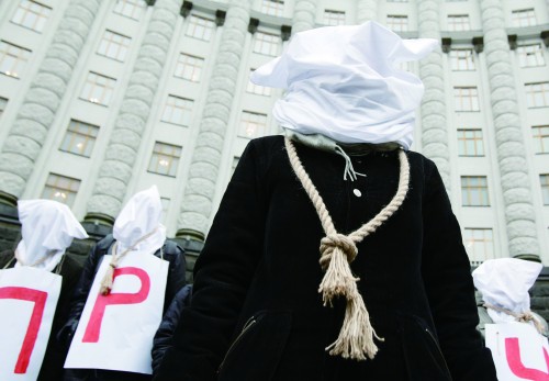 12月23日,乌克兰基辅,患者和活动家们头罩白套,脖缠绳索,在政府大楼外集会,抗议2016年预算草案削减艾滋病、肝炎、肿瘤等疾病药品供应的预算。