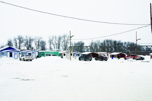 小木屋里设施齐备,有沙发、餐桌椅、火炉、不限量的木材,以及电灯和电源插座。游客们可以把私家车开上河面,停靠在自己租用的冰钓小屋门口,脚下是坚实的冰层,冰下是湍急的河流……