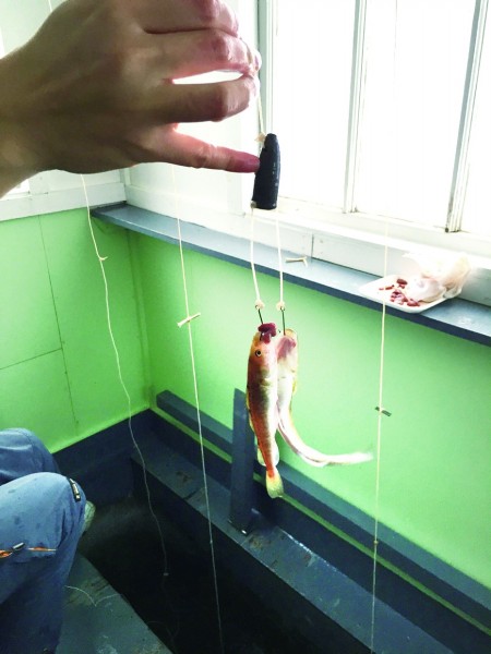 这时,一个朋友发出了一阵豪放的欢呼,原来他竟然一次钓上来两条小鱼。银色的小鳕鱼在空中努力扭着身子,试图挣脱冰冷的鱼钩。它们在空中跳跃着的样子真是让人喜爱。据说这种小鳕鱼的肉质极其鲜美,所以我的喜爱也无法让它们摆脱成为盘中餐的命运。