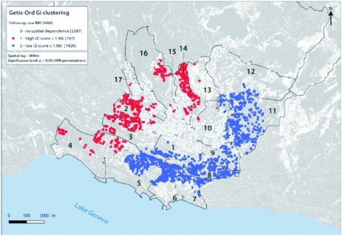 粗看上去,这幅统计图符合“肥胖跟贫困和低收入相关”的预设结论。但令人诧异的是,当作者把目光集中于中等收入阶层时,结果并没有大的变化。即使把收入项完全删去,洛桑的西部依然满是红点。具体一些说,高BMI并不是、至少不全是由居民收入决定。