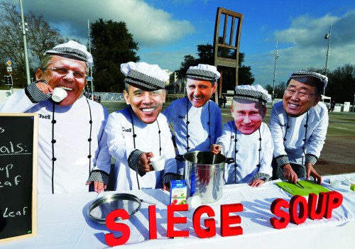 1月29日,活动人士在瑞士日内瓦戴着俄罗斯外长拉夫罗夫、美国总统奥巴马、叙利亚总统阿萨德、俄总统普京和联合国秘书长潘基文的面具,讽刺进展缓慢的叙利亚和谈。 |
