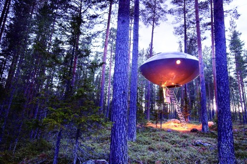 美国科幻电视剧《X档案》的迷你剧版本上个月刚在美洲上映,片中的UFO旅馆再次点燃了人们对UFO树屋的兴趣。在瑞典就有这样造型奇特的树屋,当夜晚来临,椭圆形的屋子悬在半空之中,圆形窗户透出隐隐的黄光,看上去就像挂在树上的飞碟,让人惊艳叫绝。