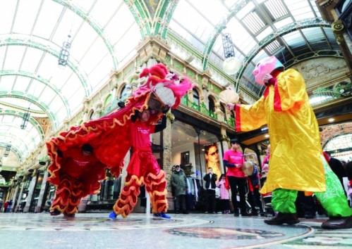 大年初六,英国查茨伍德的购物中心举办大型舞狮表演,配合书法和功夫展示,“美猴王”现身和孩子们一起玩耍。财神爷塑像出现在购物中心,供人拍照留念。