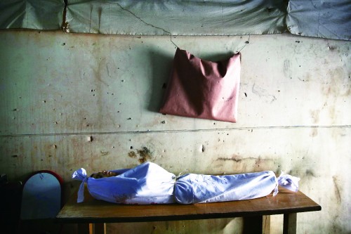 2月15日,一个男孩在空袭中丧生,尸体被送到叙利亚杜马的临时停尸房。 |