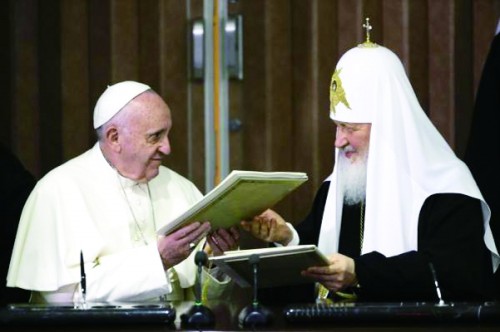 2月12日,古巴哈瓦那,罗马天主教教皇方济各和俄罗斯东正教大牧首基里尔在何塞·马蒂国际机场会面。