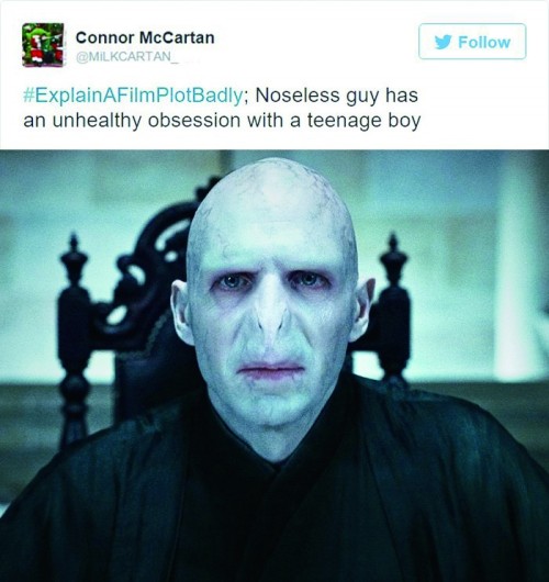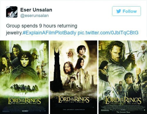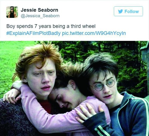 《哈利·波特》系列电影讲述“一个男孩当了7年电灯泡”,《美女与野兽》是“斯德哥尔摩综合征”,《暮光之城》被总结为“暴脾气妹子为了要一个僵尸还是一条狗纠结了好几年”,有人描述《白雪公主》是“一哥们儿在森林里亲吻死尸,旁边7个哥们儿围观”,经典的《魔戒》三部曲则是“一群人花了9小时就为了跑去还个首饰”。