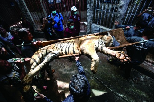 5月30日,泰国野生动物保护局突击搜查了一座饲养老虎的寺庙。这座被称为“老虎寺”的寺庙位于曼谷西边的北碧府,名为巴銮达博寺,拥有上百只老虎,已成为游客追捧的旅游景点。在那里,游客付钱就可以与老虎合照,还能拿着奶瓶给小虎崽喂奶。