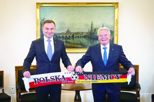 6月16日,德国柏林,波兰总统安杰伊·杜达到访德国,同德总统约阿希姆·高克举球迷围巾助威欧洲杯。