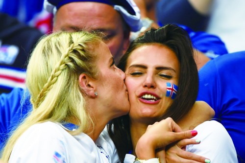 7月3日,法国圣丹尼斯,法国VS冰岛的赛场上,球迷庆祝进球。