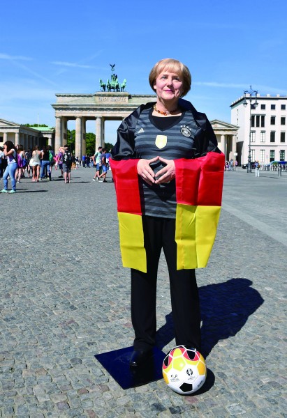 6月7日,德国柏林,杜莎夫人蜡像馆制作的德国总理默克尔的蜡像身着2016年欧洲杯德国队服,在勃兰登堡门前展出。