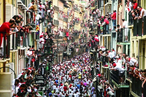 7月10日,西班牙潘普洛纳,“奔牛节”第四天,人们挤在街道两旁的阳台上观看奔牛活动。