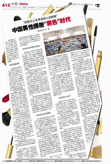 去年,中国男性个人护理产品的销售额增长了7个百分点,高于整体5%的涨幅。在一线城市,每名男子平均每天使用2.5种护肤品。不过在基础护理之外,中国男性的热情并不高涨。调查显示,13%的男性使用香水或除臭剂,专业的男性护肤和化妆品只占中国市场总份额的5%。分析人士认为,随着男性事业心和不安全感的增长,这个比例会在未来几年内迅速提升。