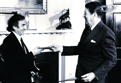 1985年4月,美国前总统里根授予威塞尔国会金质奖章。