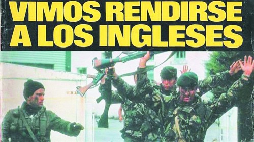 好不容易赶到政府大楼前,他们已陷入阿根廷人的三面夹击。就在僵持之际,双方高官协商停战,阿穆尔带着自己的士兵高举双手走出大楼。英国《泰晤士报》记者上前,为他们拍下了一张头条照片。