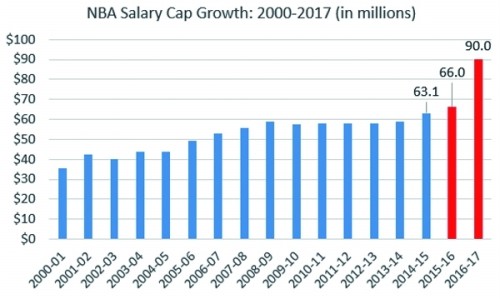更重要的是,杜兰特的自由转会恰逢前所未有的机遇,那就是:NBA“工资帽”的总额上涨了2400万美元,至9400万美元(约合6.29亿人民币)。这样一来,不仅大牌球星可以放心大胆地索取“顶薪合同”,一些能力稍差的球星甚至个别二流球员也有可能挣大钱。