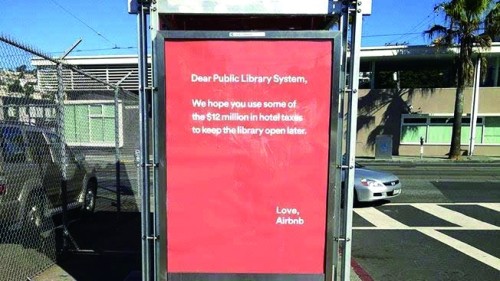 Airbnb曾在旧金山街头打出了一组户外广告,用公开信的形式向各公共机构抱怨。图中广告写道:“亲爱的公共图书馆系统,希望你们能将那1200万美元里的一部分,用于让图书馆晚点关门。爱你的Airbnb。”