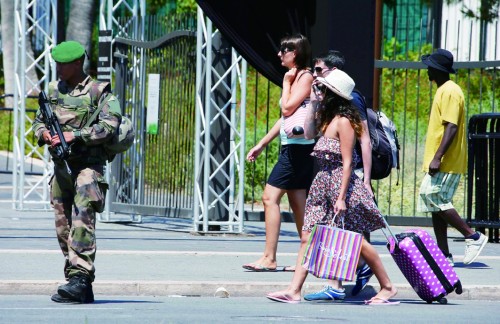 7月18日,法国尼斯,士兵在街头巡逻。恐怖袭击使法国旅游业遭受重创。