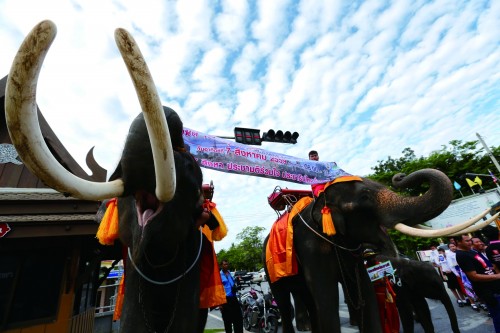 当地时间8月1日,泰国大城府,当地民众参加关于8月7日新宪法公投的活动。有人骑在大象背上举着标语,并通过大象的鼻子分发传单。